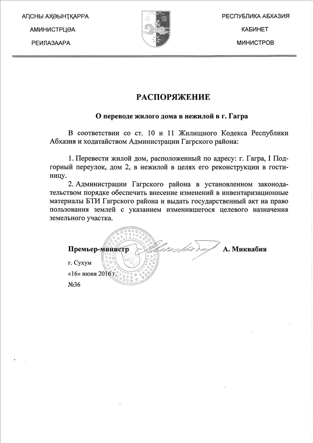 Распоряжение Кабинета Министров Республики Абхазия от 16.06.2016 № 36 "О переводе жилого дома в нежилой в г. Гагра"