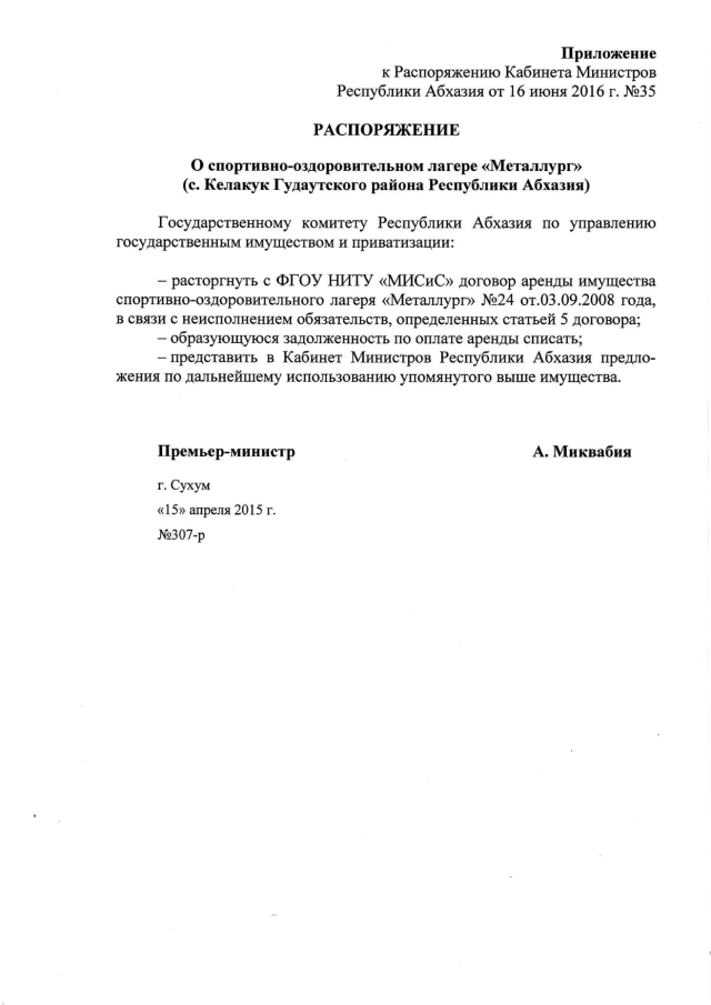 Распоряжение Кабинета Министров Республики Абхазия от 16.06.2016 № 37 "Об утверждении Распоряжения Премьер-министра Республики Абхазия от 15.04.2015 г. № 307-р"