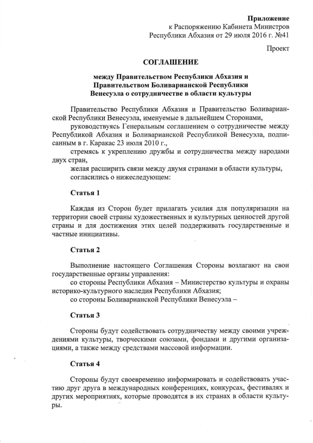 Распоряжение Кабинета Министров Республики Абхазия от 29.07.2016 № 41 "О заключении Соглашения между Правительством Республики Абхазия и Правительством Боливарианской Республики Венесуэла о сотрудничестве в области культуры"