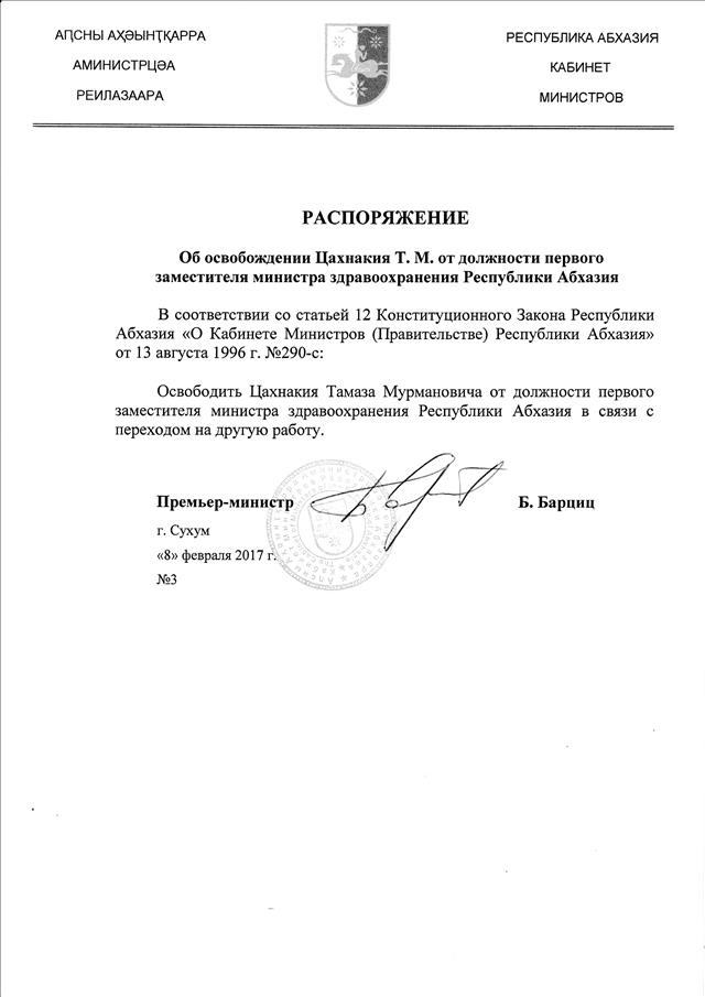 Распоряжение Кабинета Министров Республики Абхазия от 08.02.2017 № 3 "Об освобождении Цахнакия Т.М. от должности первого заместителя министра здравоохранения Республики Абхазия"