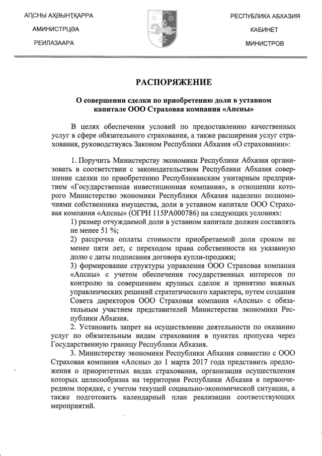 Распоряжение Кабинета Министров Республики Абхазия от 08.02.2017 № 8 "О совершении сделки по приобретению доли в уставном капитале ООО Страховая компания "Апсны"
