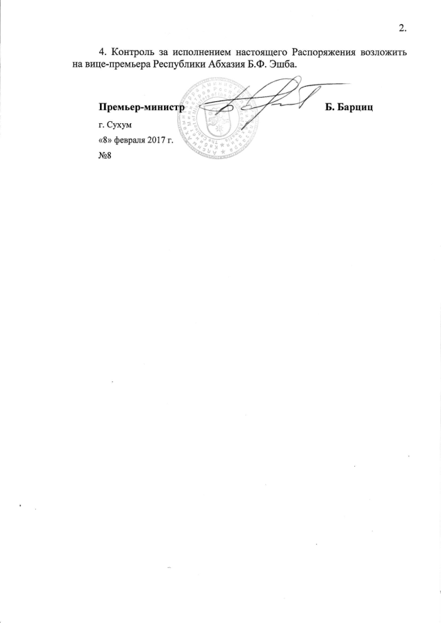 Распоряжение Кабинета Министров Республики Абхазия от 08.02.2017 № 8 "О совершении сделки по приобретению доли в уставном капитале ООО Страховая компания "Апсны"