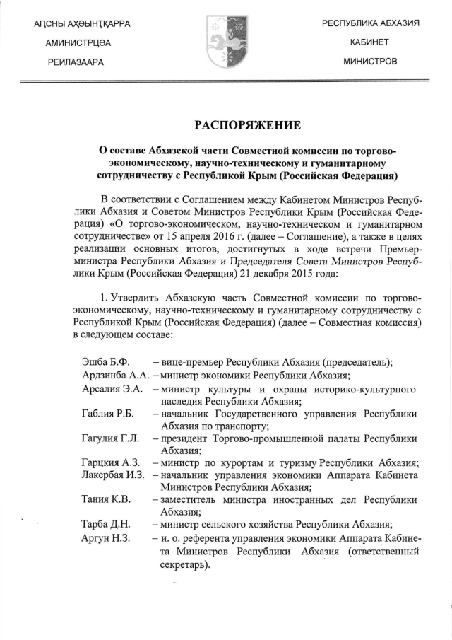 Распоряжение Кабинета Министров Республики Абхазия от 08.02.2017 № 9 "О составе Абхазской части Совместной комиссии по торгово-экономическому, научно-техническому и гуманитарному сотрудничеству с Республикой Крым (Российская Федерация)"