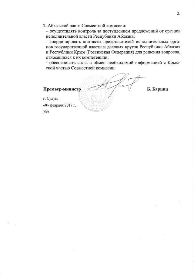 Распоряжение Кабинета Министров Республики Абхазия от 08.02.2017 № 9 "О составе Абхазской части Совместной комиссии по торгово-экономическому, научно-техническому и гуманитарному сотрудничеству с Республикой Крым (Российская Федерация)"