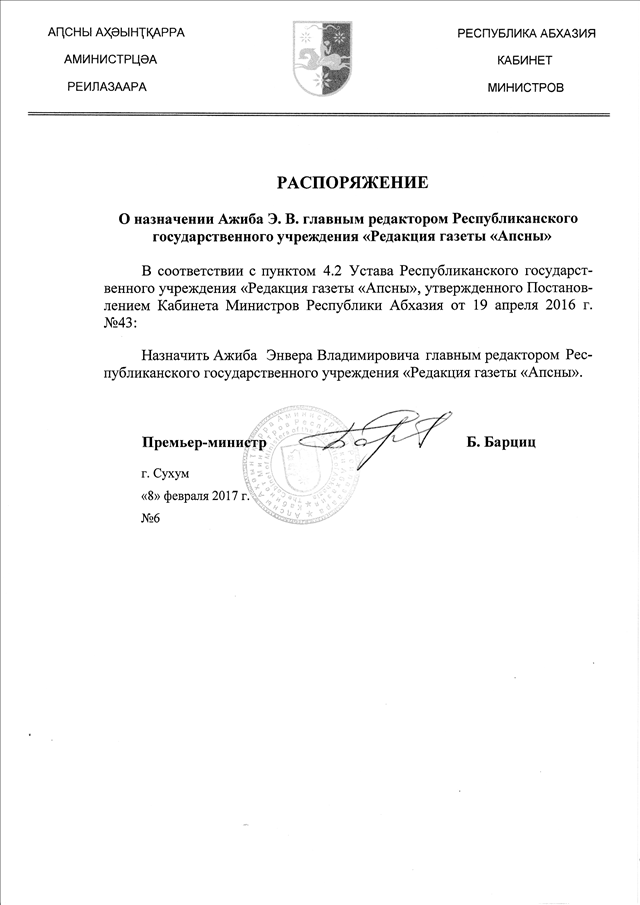 Распоряжение Кабинета Министров Республики Абхазия от 08.02.2017 № 6 "О назначении Ажиба Э.В. главным редактором Республиканского государственного учреждения "Редакция газеты "Апсны"