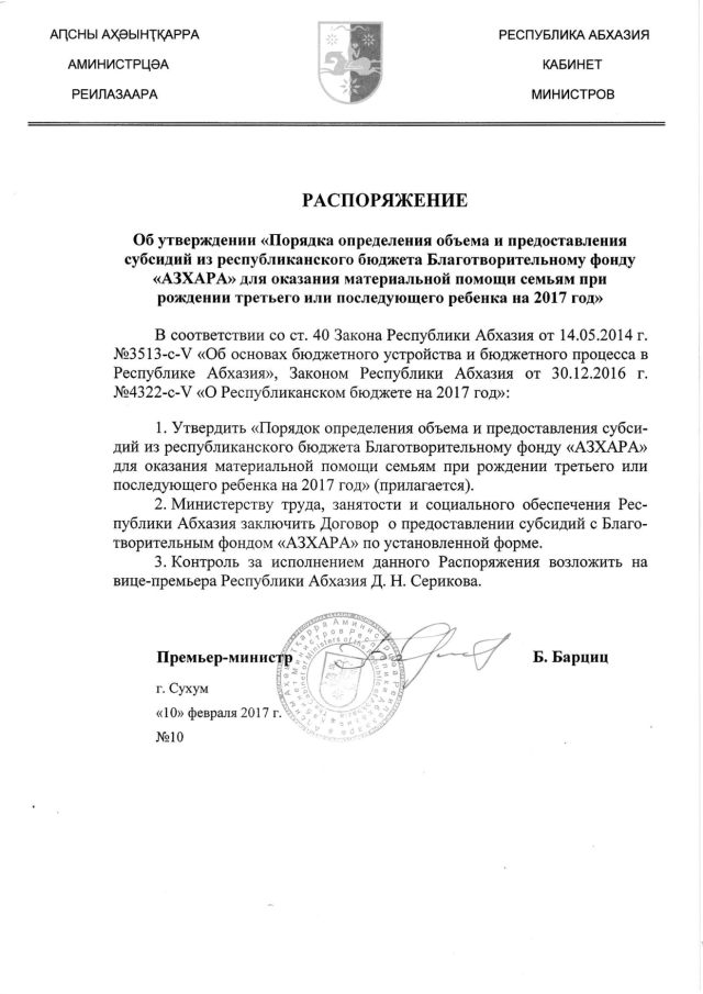 Распоряжение Кабинета Министров Республики Абхазия от 10.02.2017 № 10 "Об утверждении "Порядка определения объема и предоставления субсидий из республиканского бюджета Благотворительному фонду "АЗХАРА" для оказания материальной помощи семьям при рождении третьего или последующего ребенка на 2017 год"