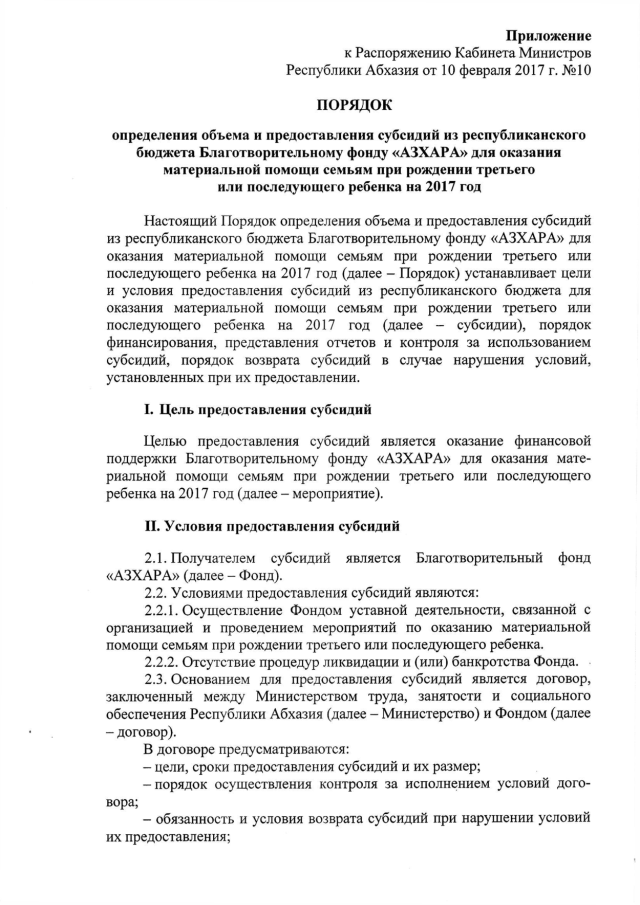Распоряжение Кабинета Министров Республики Абхазия от 10.02.2017 № 10 "Об утверждении "Порядка определения объема и предоставления субсидий из республиканского бюджета Благотворительному фонду "АЗХАРА" для оказания материальной помощи семьям при рождении третьего или последующего ребенка на 2017 год"