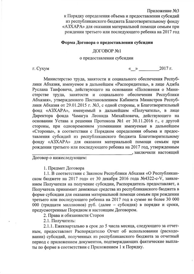 Распоряжение Кабинета Министров Республики Абхазия от 10.02.2017 № 10 "Об утверждении "Порядка определения объема и предоставления субсидий из республиканского бюджета Благотворительному фонду "АЗХАРА" для оказания материальной помощи семьям при рождении третьего или последующего ребенка на 2017 год"