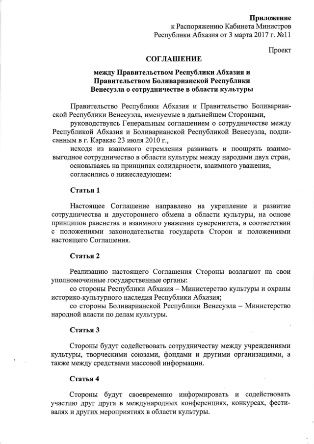 Распоряжение Кабинета Министров Республики Абхазия от 03.03.2017 № 11 "О заключении Соглашения между Правительством Республики Абхазия и Правительством Боливарианской Республики Венесуэла о сотрудничестве в области культуры"