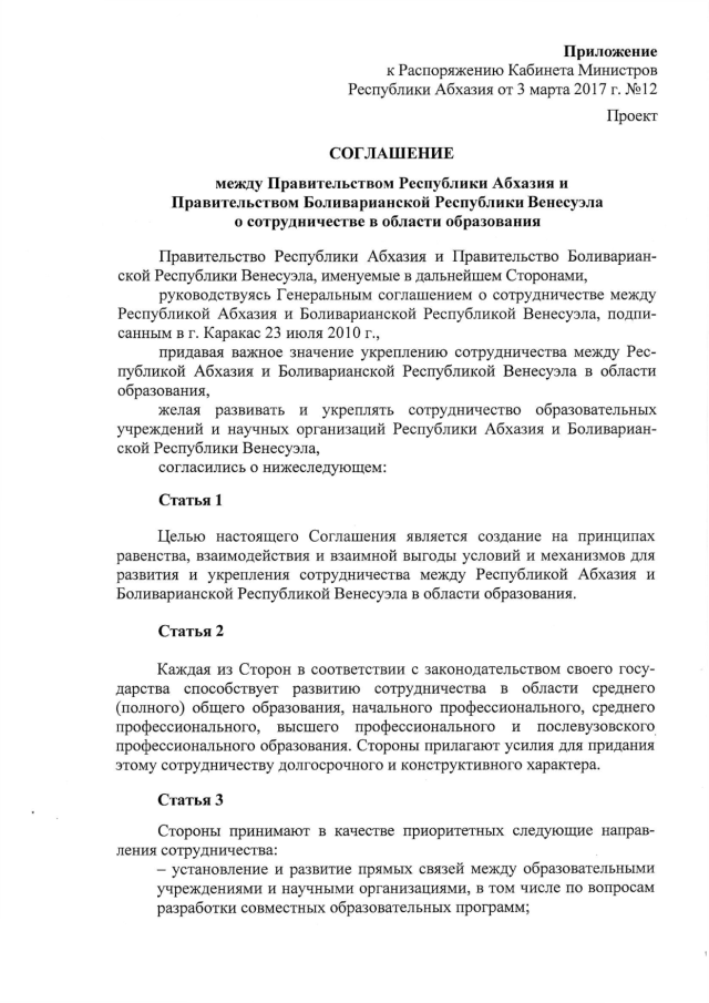 Распоряжение Кабинета Министров Республики Абхазия от 03.03.2017 № 12 "О заключении Соглашения между Правительством Республики Абхазия и Правительством Боливарианской Республики Венесуэла о сотрудничестве в области образования"