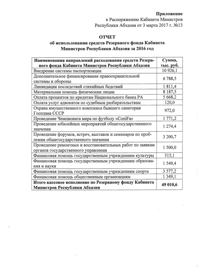 Распоряжение Кабинета Министров Республики Абхазия от 03.03.2017 № 13 "Об утверждении "Отчета об использовании средств Резервного фонда Кабинета Министров Республики Абхазия за 2016 год"