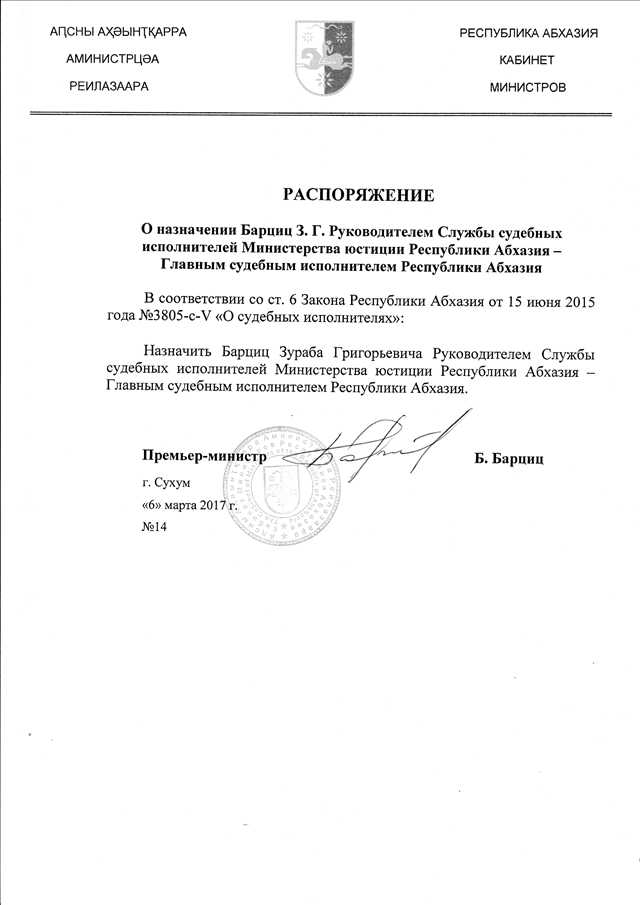 Распоряжение Кабинета Министров Республики Абхазия от 06.03.2017 № 14 "О назначении Барциц 3.Г. Руководителем Службы судебных исполнителей Министерства юстиции Республики Абхазия - Главным судебным исполнителем Республики Абхазия"