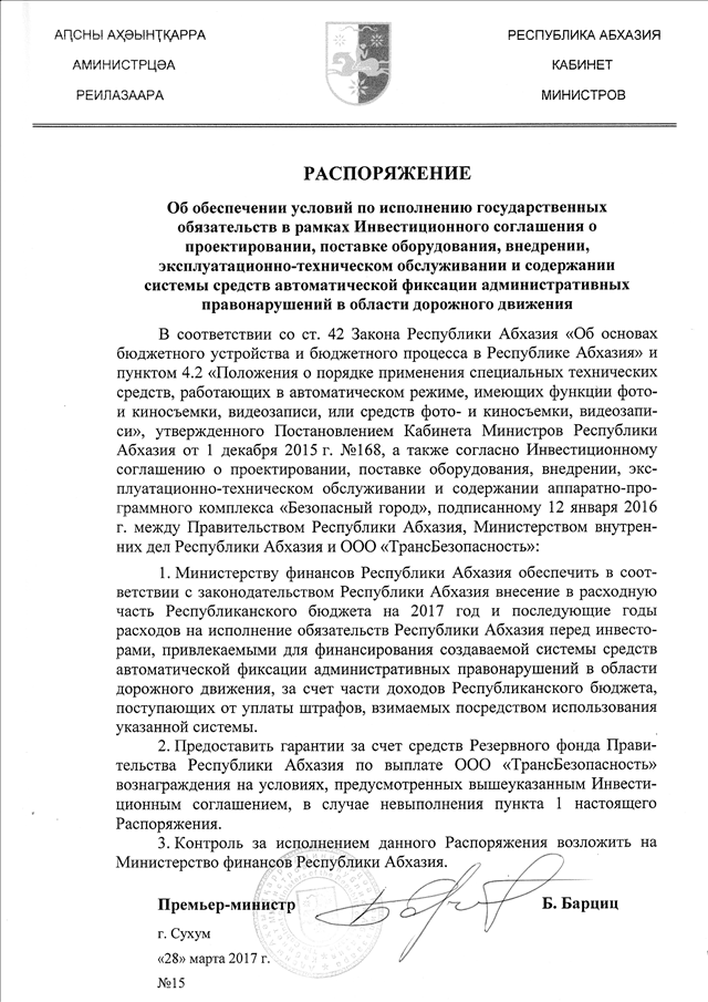 Распоряжение Кабинета Министров Республики Абхазия от 28.03.2017 № 15 "Об обеспечении условий по исполнению государственных обязательств в рамках Инвестиционного соглашения о проектировании, поставке оборудования, внедрении, эксплуатационно-техническом обслуживании и содержании системы средств автоматической фиксации административных правонарушений в области дорожного движения"