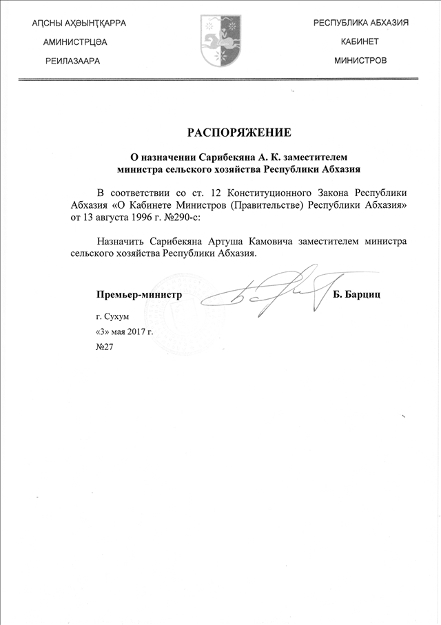 Распоряжение Кабинета Министров Республики Абхазия от 03.05.2017 № 27 "О назначении Сарибекяна А.К. заместителем министра сельского хозяйства Республики Абхазия"