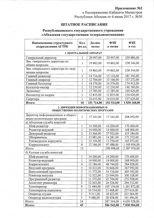 Распоряжение Кабинета Министров Республики Абхазия от 06.06.2017 № 30 "Об утверждении структуры и штатного расписания Республиканского государственного учреждения "Абхазская государственная телерадиокомпания"