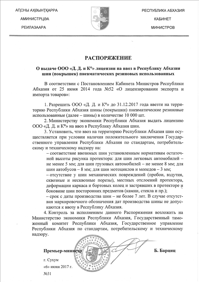Распоряжение Кабинета Министров Республики Абхазия от 06.06.2017 № 31 "О выдаче ООО "Д.Д. и Ко" лицензии на ввоз в Республику Абхазия шин (покрышек) пневматических резиновых использованных"