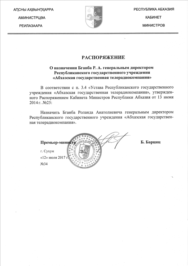 Распоряжение Кабинета Министров Республики Абхазия от 12.07.2017 № 34 "О назначении Бганба Р.А. генеральным директором Республиканского государственного учреждения "Абхазская государственная телерадиокомпания"
