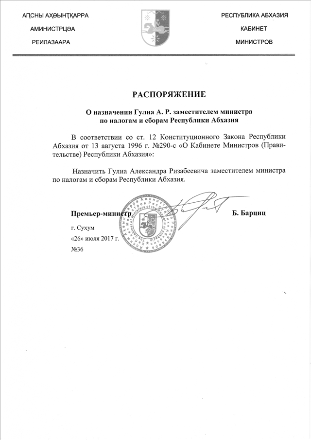 Распоряжение Кабинета Министров Республики Абхазия от 26.07.2017 № 36 "О назначении Гулиа А.Р. заместителем министра по налогам и сборам Республики Абхазия"