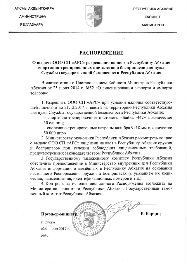 Распоряжение Кабинета Министров Республики Абхазия от 26.07.2017 № 40 "О выдаче ООО СП "АРС" разрешения на ввоз в Республику Абхазия спортивно-тренировочных пистолетов и боеприпасов для нужд Службы государственной безопасности Республики Абхазия"