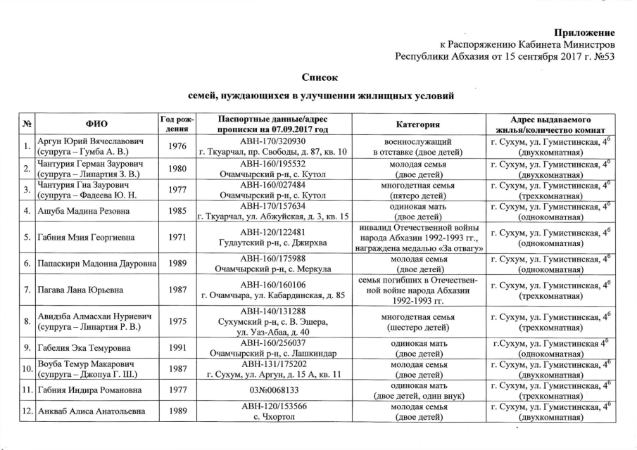 Распоряжение Кабинета Министров Республики Абхазия от 15.09.2017 № 53 "О мерах по улучшению жилищных условий семей, остро нуждающихся в социальной защите"