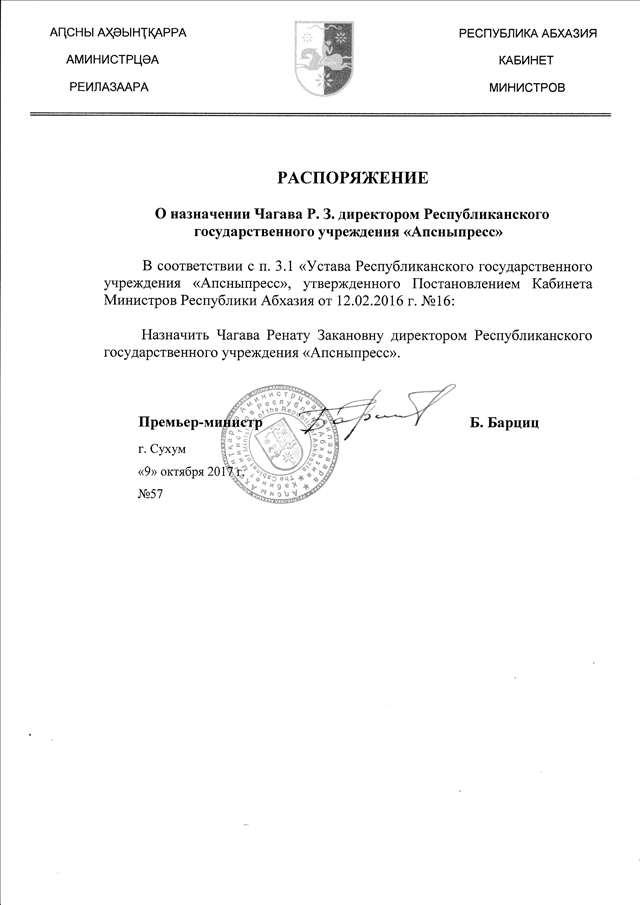 Распоряжение Кабинета Министров Республики Абхазия от 09.10.2017 № 57 "О назначении Чагава Р.3. директором Республиканского государственного учреждения "Апсныпресс"