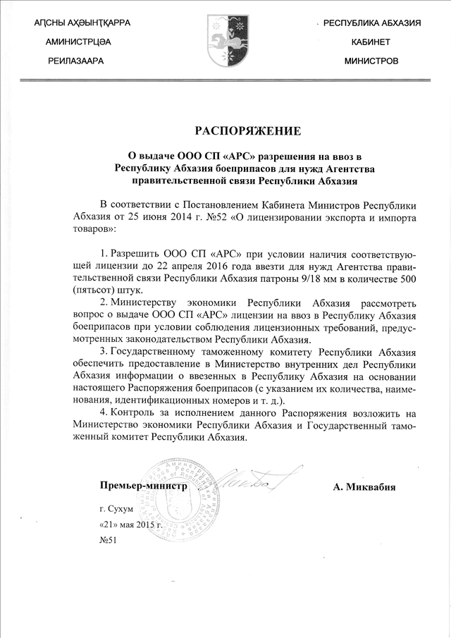 Распоряжение Кабинета Министров Республики Абхазия от 21.05.2015 № 51 "О выдаче ООО СП "АРС" разрешения на ввоз в Республику Абхазия боеприпасов для нужд Агентства правительственной связи Республики Абхазия"