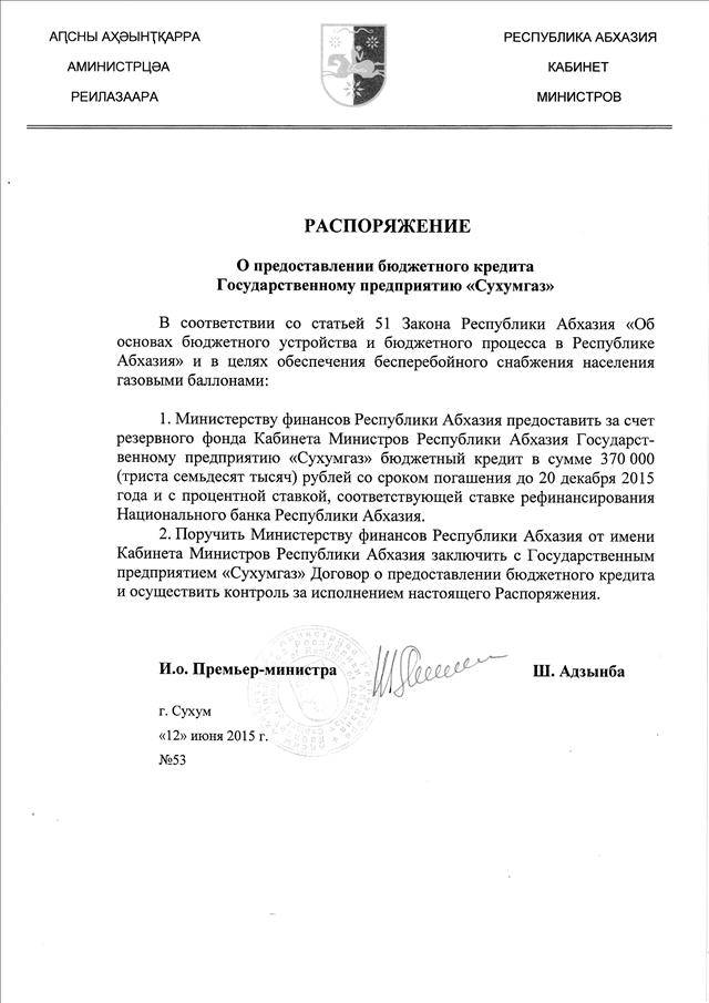 Распоряжение Кабинета Министров Республики Абхазия от 12.06.2015 № 53 "О предоставлении бюджетного кредита Государственному предприятию "Сухумгаз"