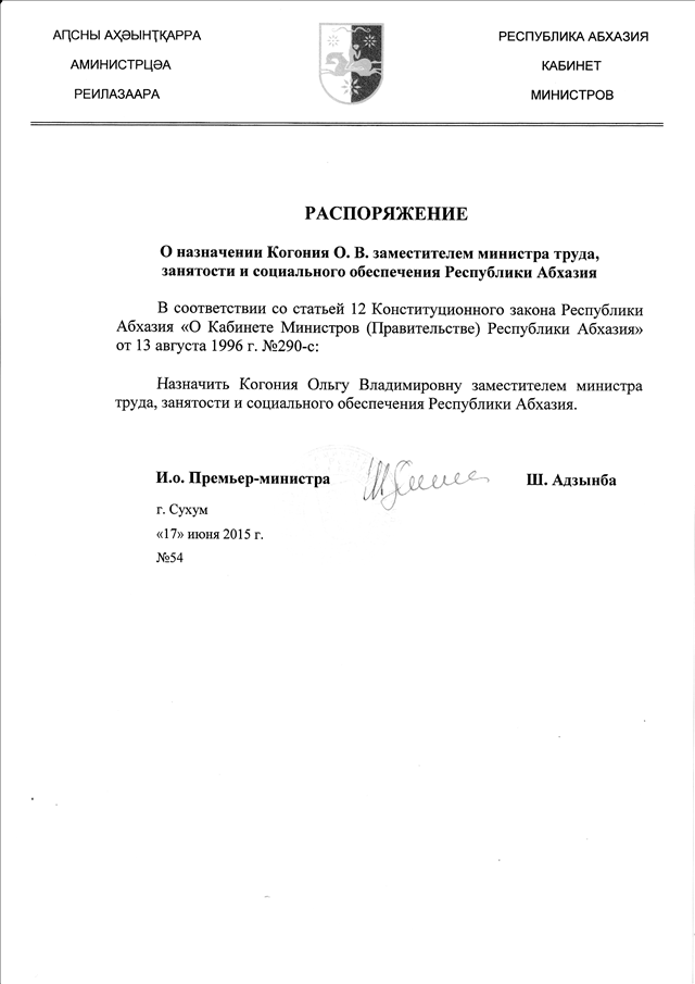 Распоряжение Кабинета Министров Республики Абхазия от 17.06.2015 № 54 "О назначении Когония О.В. заместителем министра труда, занятости и социального обеспечения Республики Абхазия"