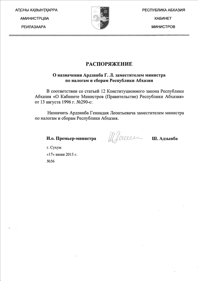 Распоряжение Кабинета Министров Республики Абхазия от 17.06.2015 № 56 "О назначении Ардзинба Г.Л. заместителем министра по налогам и сборам Республики Абхазия"