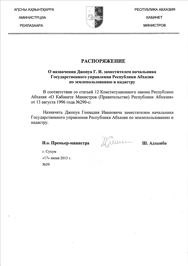 Распоряжение Кабинета Министров Республики Абхазия от 17.06.2015 № 59 "О назначении Джопуа Г.И. заместителем начальника Государственного управления Республики Абхазия по землепользованию и кадастру"