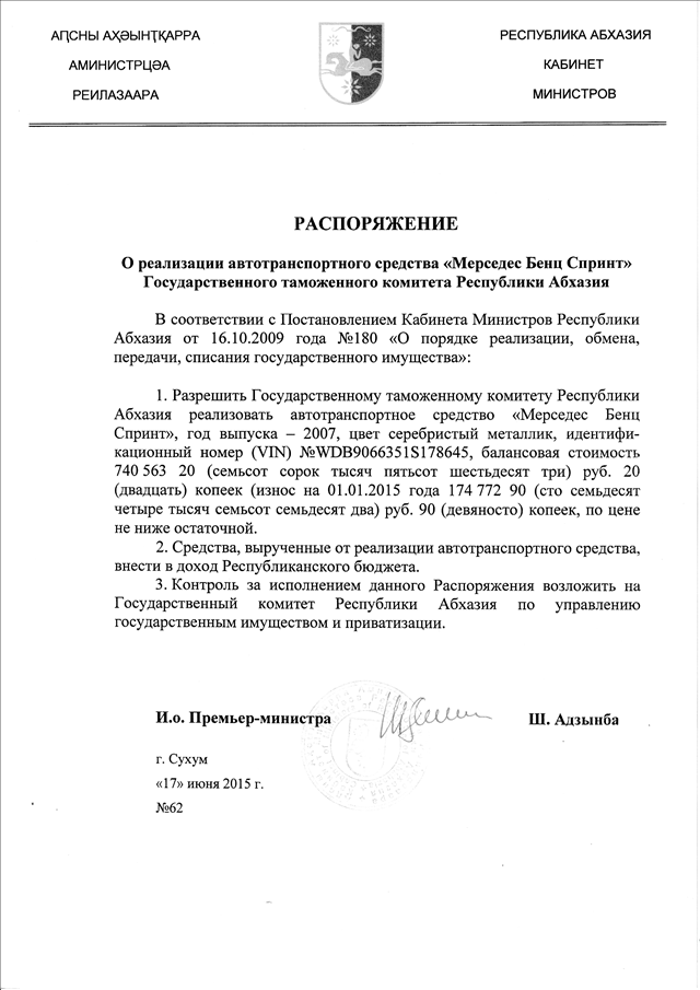 Распоряжение Кабинета Министров Республики Абхазия от 17.06.2015 № 62 "О реализации автотранспортного средства "Мерседес Бенц Спринт" Государственного таможенного комитета Республики Абхазия"