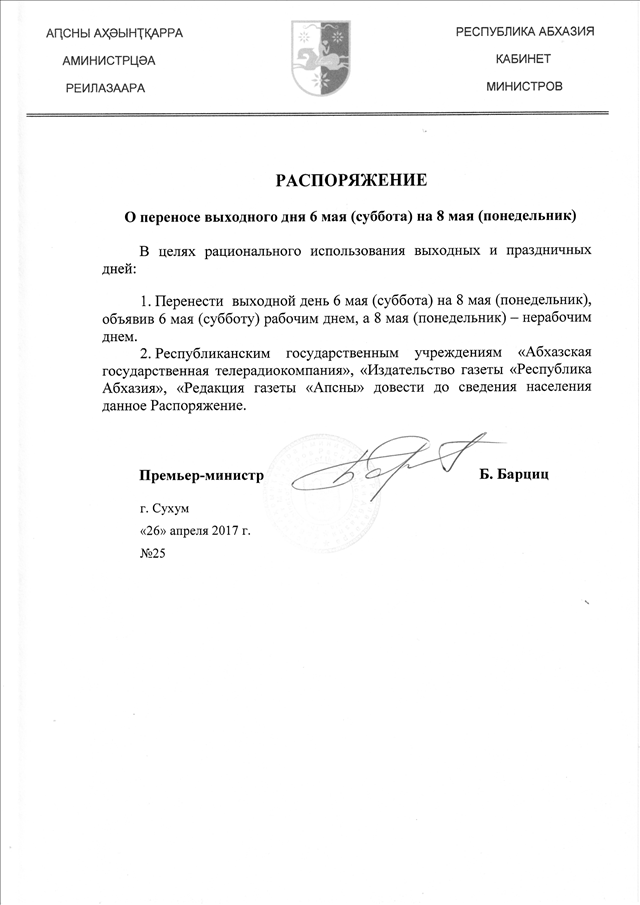 Распоряжение Кабинета Министров Республики Абхазия от 26.04.2017 № 25 "О переносе выходного дня 6 мая (суббота) на 8 мая (понедельник)"