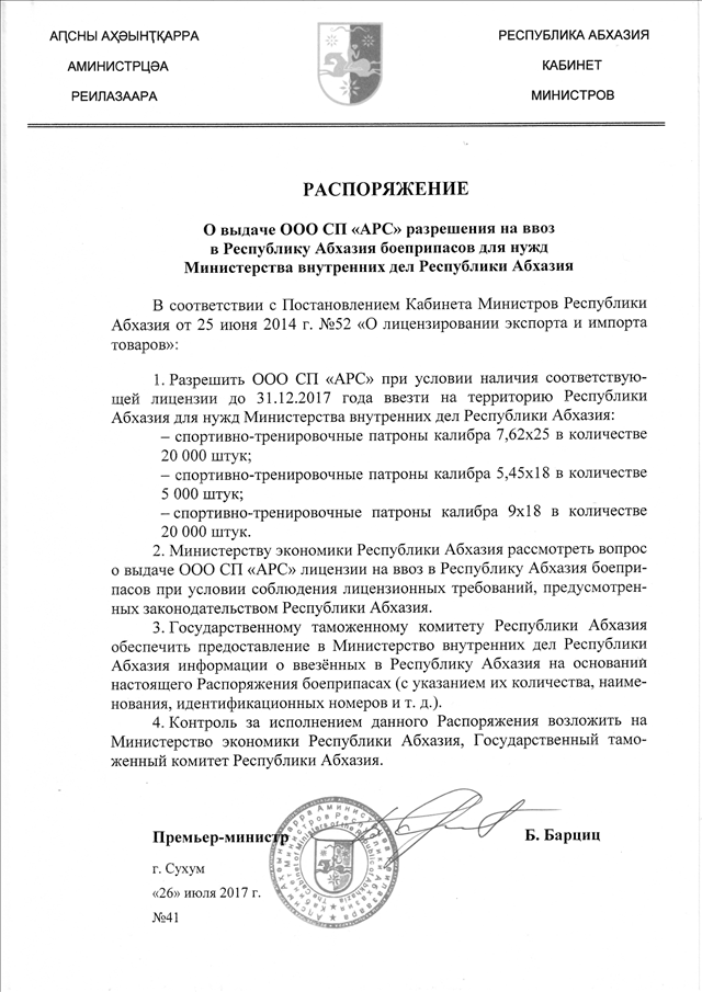 Распоряжение Кабинета Министров Республики Абхазия от 26.07.2017 № 41 "О выдаче ООО СП "АРС" разрешения на ввоз в Республику Абхазия боеприпасов для нужд Министерства внутренних дел Республики Абхазия"