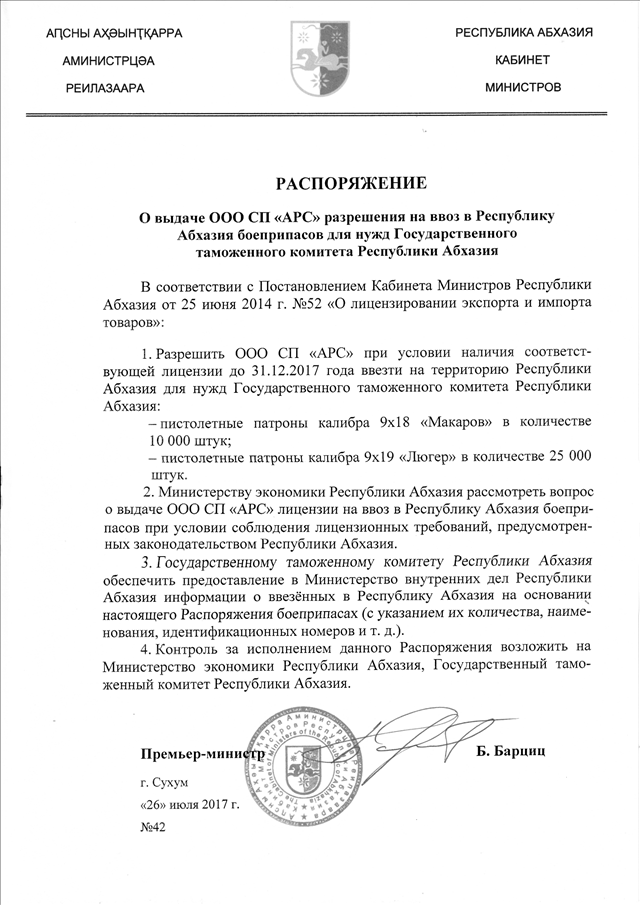 Распоряжение Кабинета Министров Республики Абхазия от 26.07.2017 № 42 "О выдаче ООО СП "АРС" разрешения на ввоз в Республику Абхазия боеприпасов для нужд Государственного таможенного комитета Республики Абхазия"