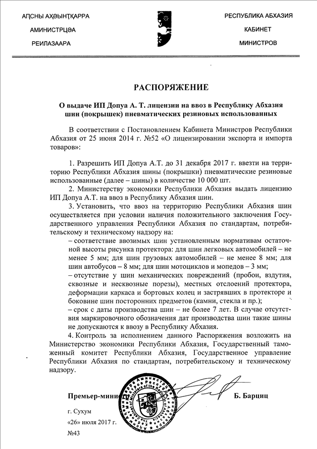 Распоряжение Кабинета Министров Республики Абхазия от 26.07.2017 № 43 "О выдаче ИП Допуа А.Т. лицензии на ввоз в Республику Абхазия шин (покрышек) пневматических резиновых использованных"