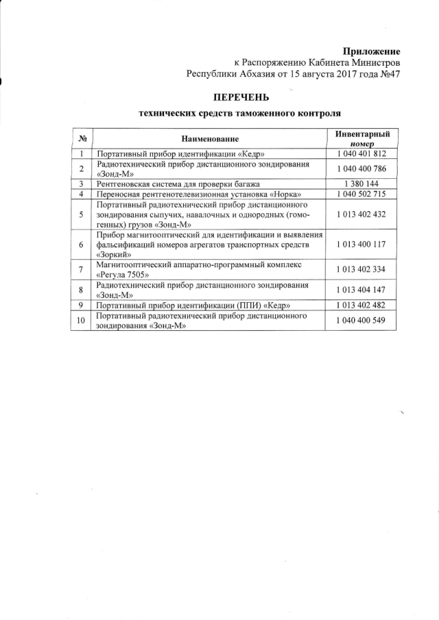Распоряжение Кабинета Министров Республики Абхазия от 15.08.2017 № 47 "О передаче и распределении гуманитарного груза - технических средств таможенного контроля Государственному таможенному комитету Республики Абхазия"