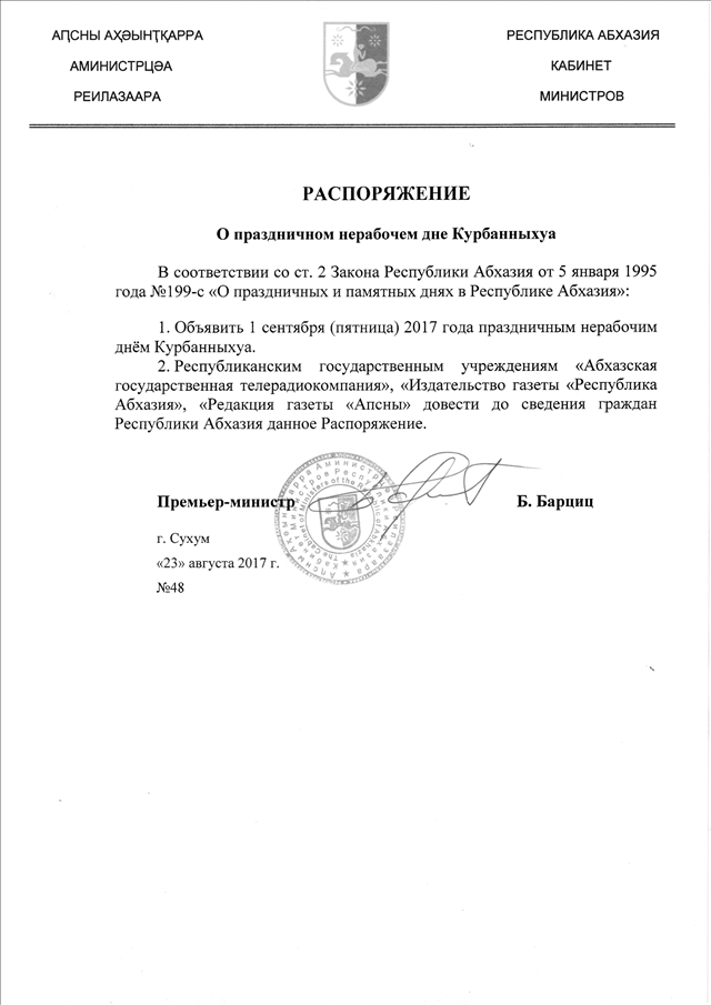 Распоряжение Кабинета Министров Республики Абхазия от 23.08.2017 № 48 "О праздничном нерабочем дне Курбанныхуа"