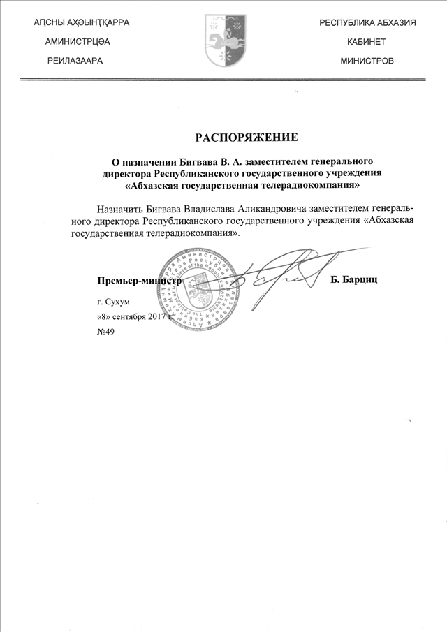 Распоряжение Кабинета Министров Республики Абхазия от 08.09.2017 № 49 "О назначении Бигвава В.А. заместителем генерального директора Республиканского государственного учреждения "Абхазская государственная телерадиокомпания"