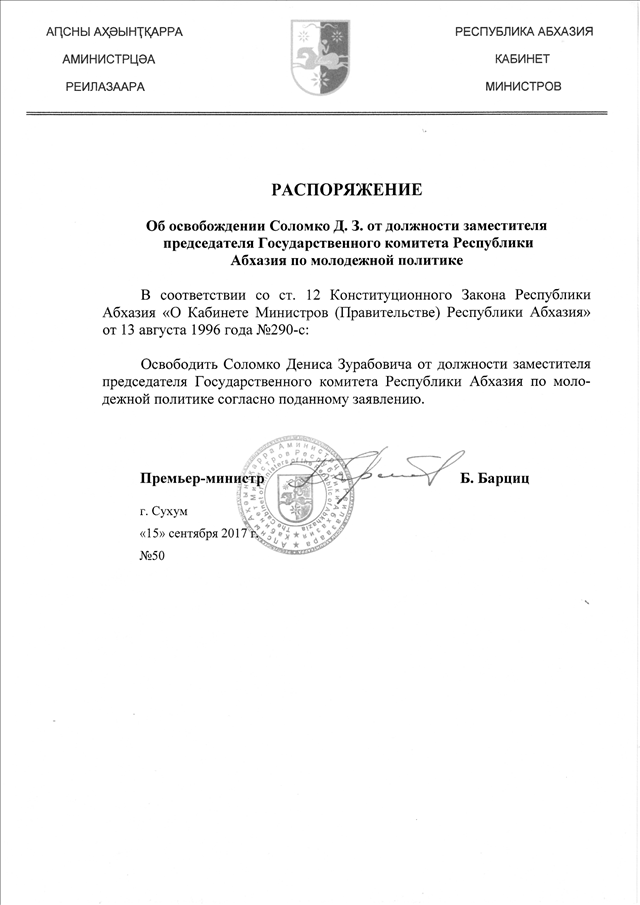 Распоряжение Кабинета Министров Республики Абхазия от 15.09.2017 № 50 "Об освобождении Соломко Д.3. от должности заместителя председателя Государственного комитета Республики Абхазия по молодежной политике"