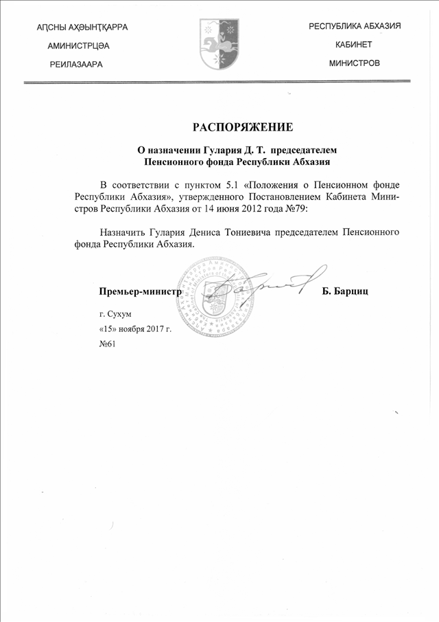 Распоряжение Кабинета Министров Республики Абхазия от 15.11.2017 № 61 "О назначении Гулария Д.Т. председателем Пенсионного фонда Республики Абхазия"