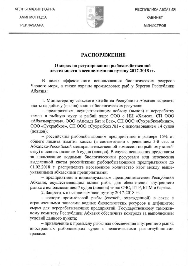Распоряжение Кабинета Министров Республики Абхазия от 08.12.2017 № 62 "О мерах по регулированию рыбохозяйственной деятельности в осенне-зимнюю путину 2017-2018 гг."