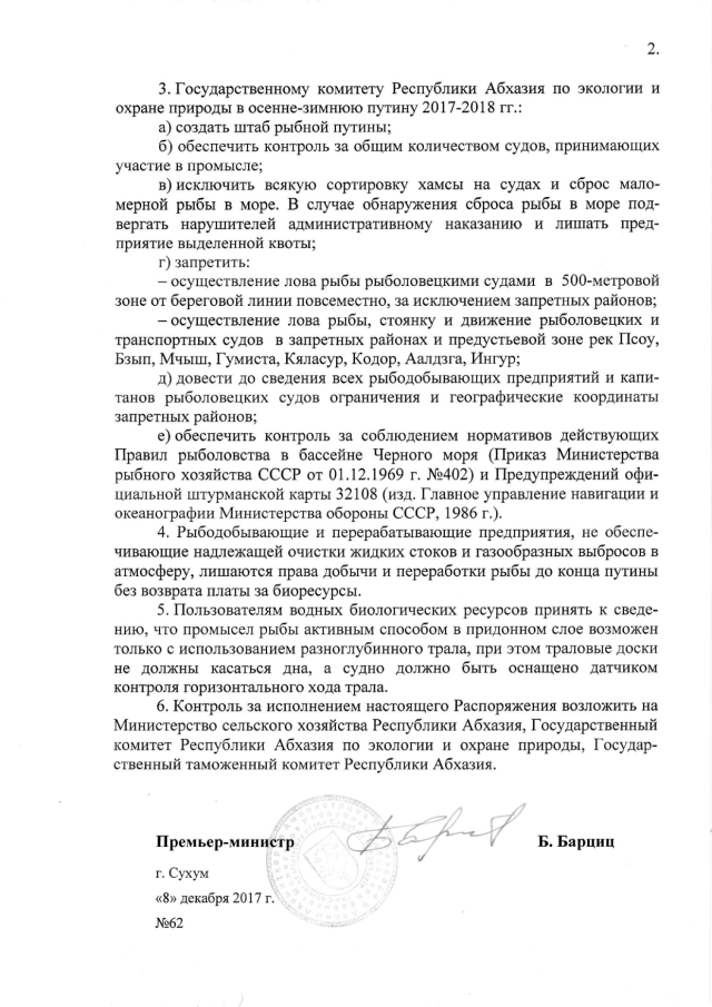 Распоряжение Кабинета Министров Республики Абхазия от 08.12.2017 № 62 "О мерах по регулированию рыбохозяйственной деятельности в осенне-зимнюю путину 2017-2018 гг."