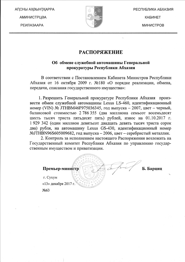 Распоряжение Кабинета Министров Республики Абхазия от 13.12.2017 № 63 "Об обмене служебной автомашины Генеральной прокуратуры Республики Абхазия"