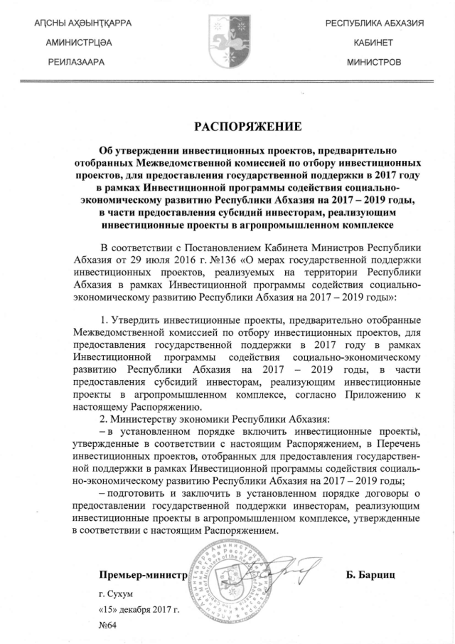 Распоряжение Кабинета Министров Республики Абхазия от 15.12.2017 № 64 "Об утверждении инвестиционных проектов, предварительно отобранных Межведомственной комиссией по отбору инвестиционных проектов, для предоставления государственной поддержки в 2017 году в рамках Инвестиционной программы содействия социально-экономическому развитию Республики Абхазия на 2017-2019 годы, в части предоставления субсидий инвесторам, реализующим инвестиционные проекты в агропромышленном комплексе"