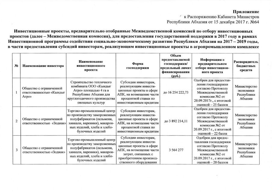 Распоряжение Кабинета Министров Республики Абхазия от 15.12.2017 № 64 "Об утверждении инвестиционных проектов, предварительно отобранных Межведомственной комиссией по отбору инвестиционных проектов, для предоставления государственной поддержки в 2017 году в рамках Инвестиционной программы содействия социально-экономическому развитию Республики Абхазия на 2017-2019 годы, в части предоставления субсидий инвесторам, реализующим инвестиционные проекты в агропромышленном комплексе"