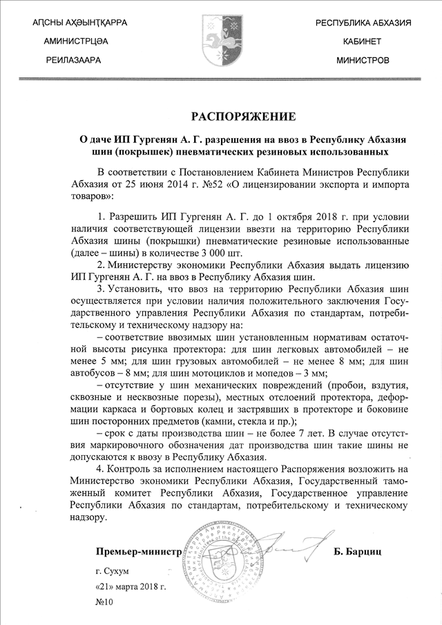 Распоряжение Кабинета Министров Республики Абхазия от 21.03.2018 № 10 "О даче ИП Гургенян А.Г. разрешения на ввоз в Республику Абхазия шин (покрышек) пневматических резиновых использованных"