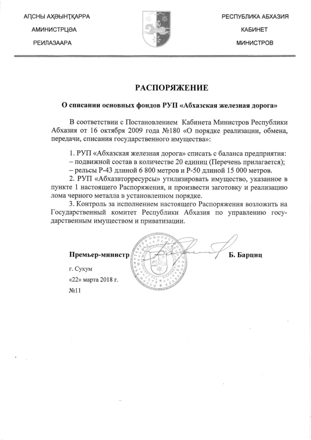 Распоряжение Кабинета Министров Республики Абхазия от 22.03.2018 № 11 "О списании основных фондов РУП "Абхазская железная дорога"