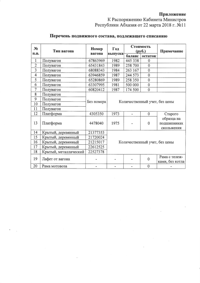 Распоряжение Кабинета Министров Республики Абхазия от 22.03.2018 № 11 "О списании основных фондов РУП "Абхазская железная дорога"