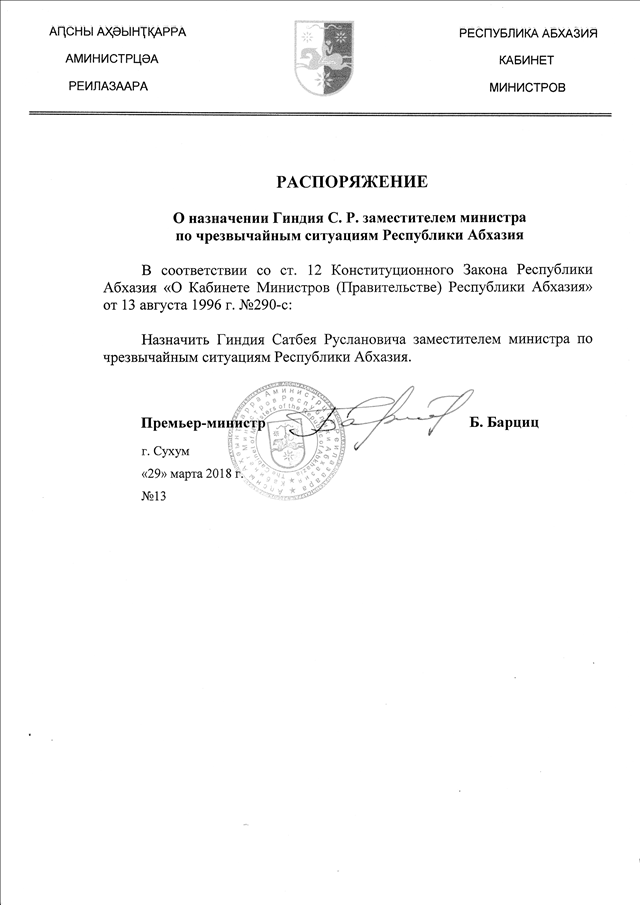 Распоряжение Кабинета Министров Республики Абхазия от 29.03.2018 № 13 "О назначении Гиндия С.Р. заместителем министра по чрезвычайным ситуациям Республики Абхазия"