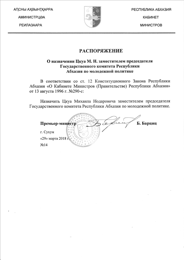 Распоряжение Кабинета Министров Республики Абхазия от 29.03.2018 № 14 "О назначении Цкуа М.Н. заместителем председателя Государственного комитета Республики Абхазия по молодежной политике"